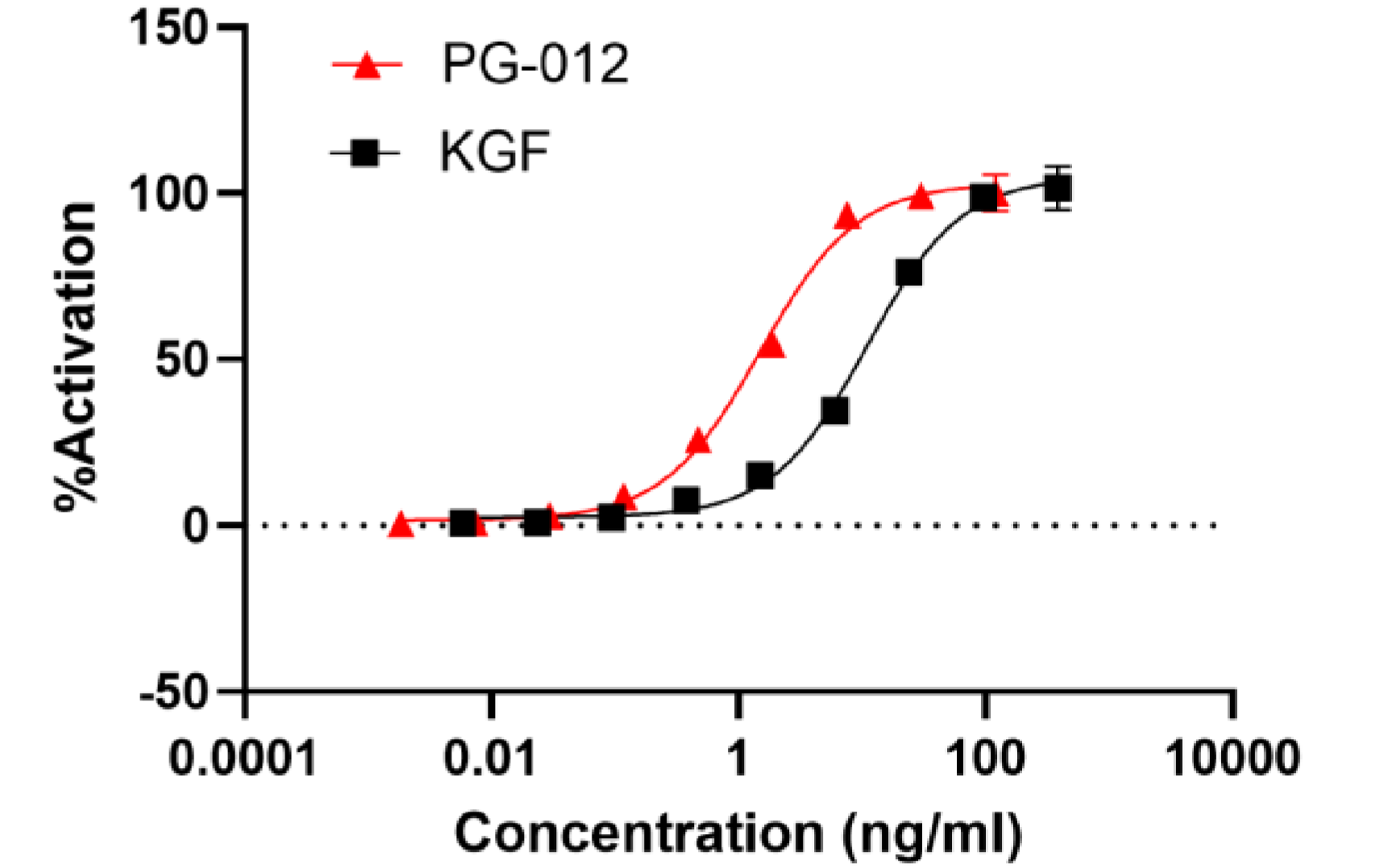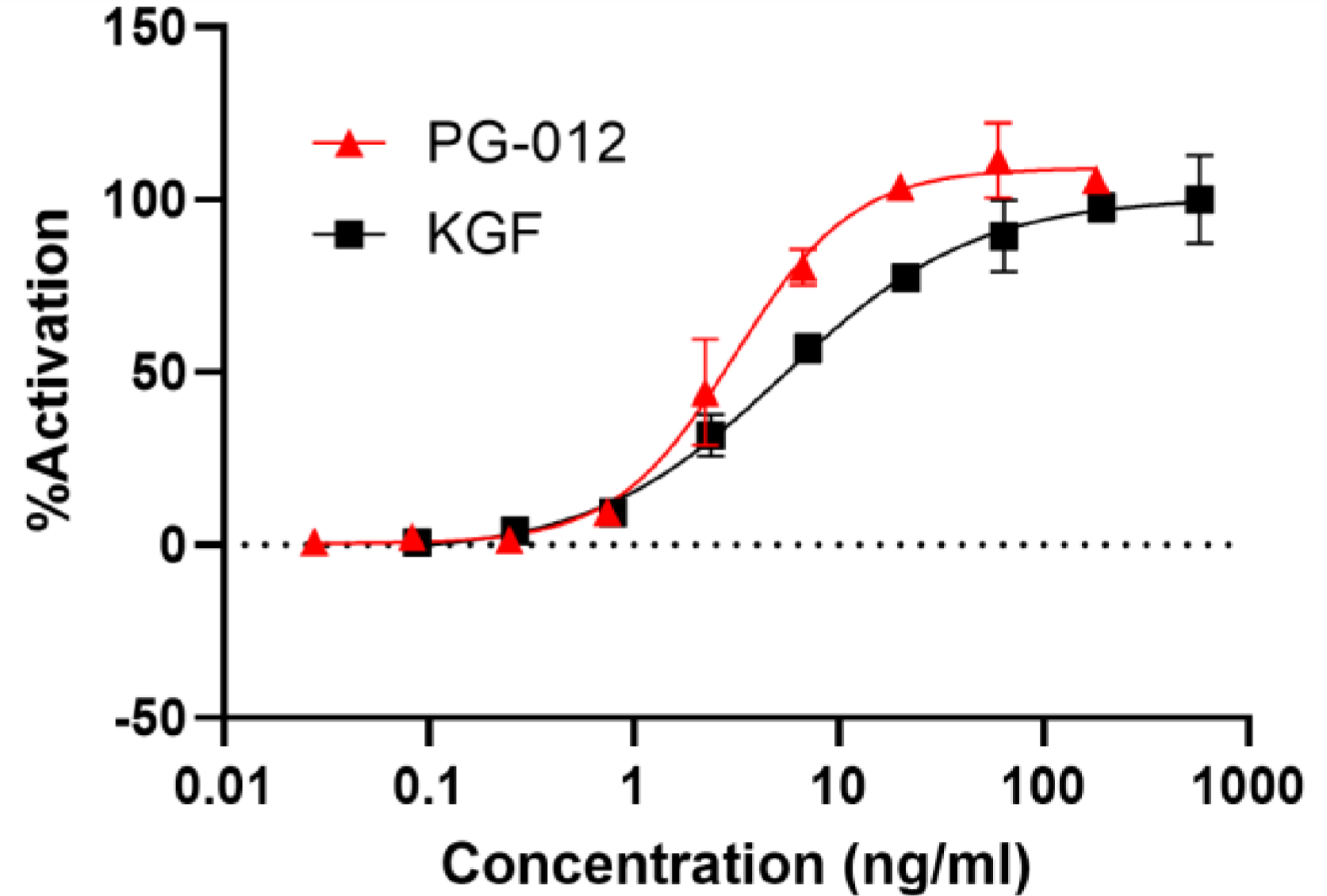 Measured by assessing ERK phosphorylation in the downstream signaling of the FGFR2b pathway, using BaF3 cells overexpressing hFGFR2b. Additionally, cell proliferation was evaluated in the same BaF3 cells overexpressing hFGFR2b. These assays were conducted in the presence of 1 unit/mL of heparin. The expected ED50 for these effects is 1.5~5 ng/mL.