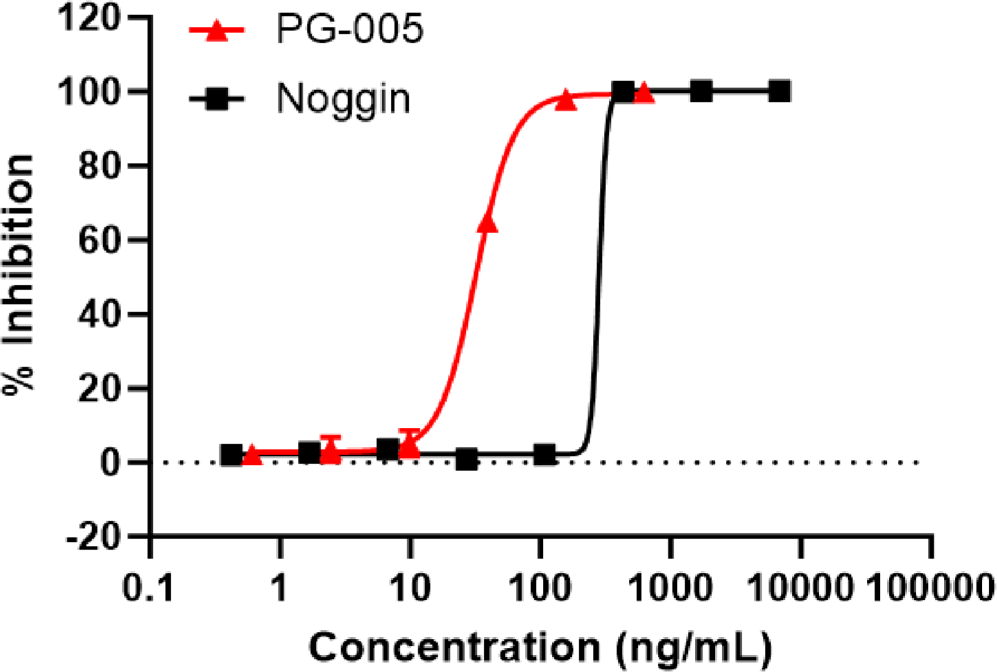 Measured by its ability to inhibit smad1 phosphorylation induced by BMP4 (2.6 ng/mL) or BMP7 (157.5 ng/mL) in A549 cell. Expected IC50 for BMP7 is ~30 ng/mL under this condition. Determine optimal concentrations for individual applications.