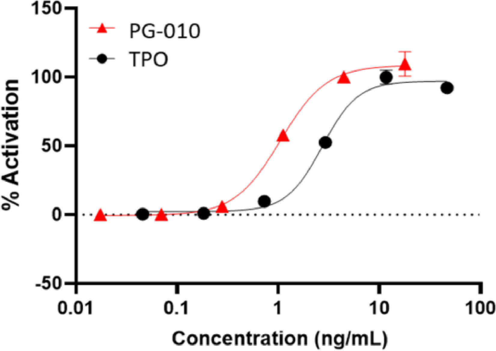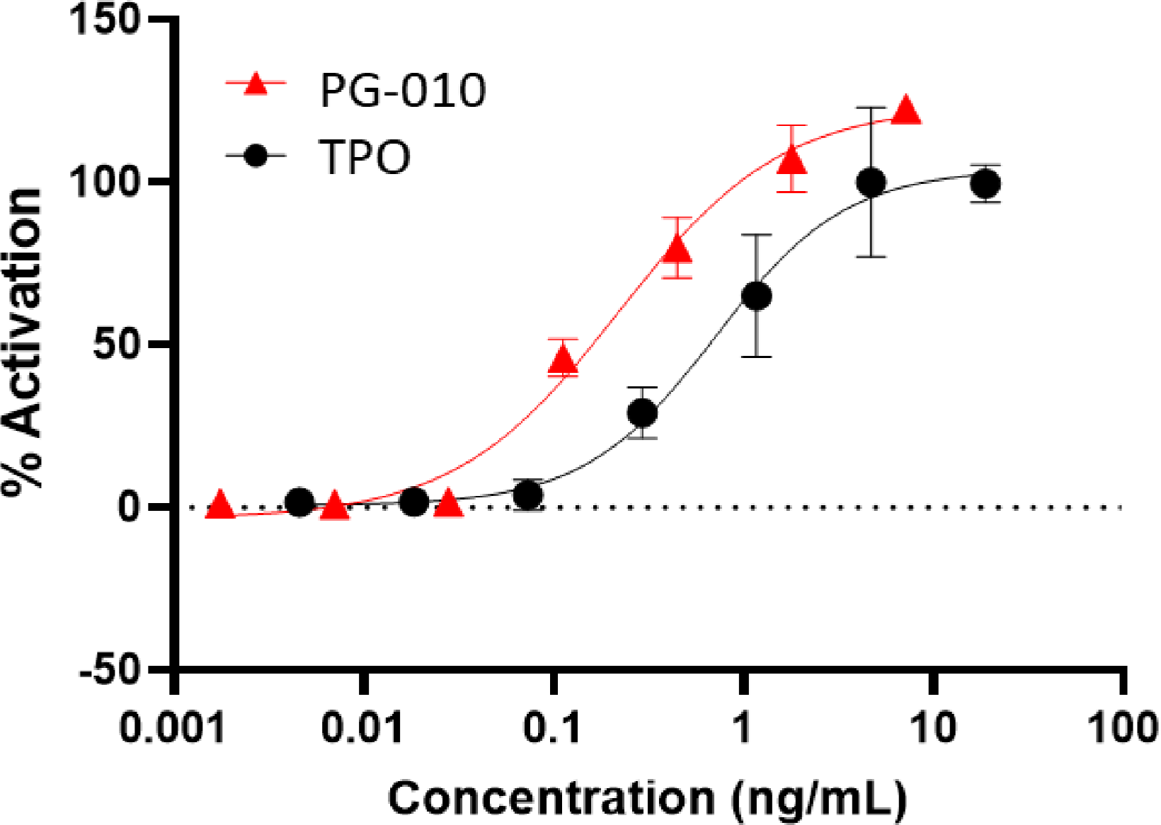 Measured by its ability to induce phosphorylation of ERK in the downstream signaling of the TPO signaling pathway, as well as by the reporter gene activation assay on the JAK2-STAT5 signaling pathway. The expected ED50 for these effects is 0.25~1.5 ng/mL. Determine optimal concentrations for individual applications.